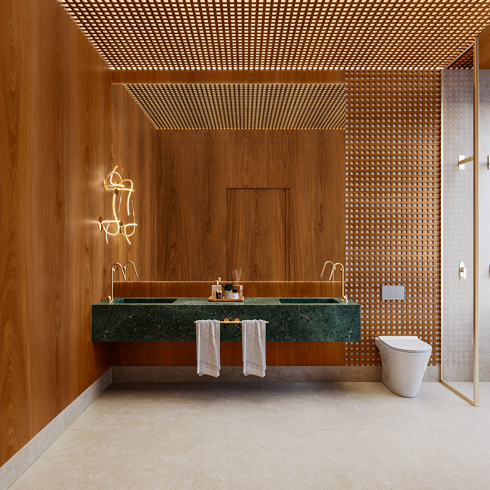 Um padrão que traduz aconchego, resistência e autenticidade, com veios naturais e tonalidade quente que constroem uma estética atemporal, valorizando projetos contemporâneos e clássicos.